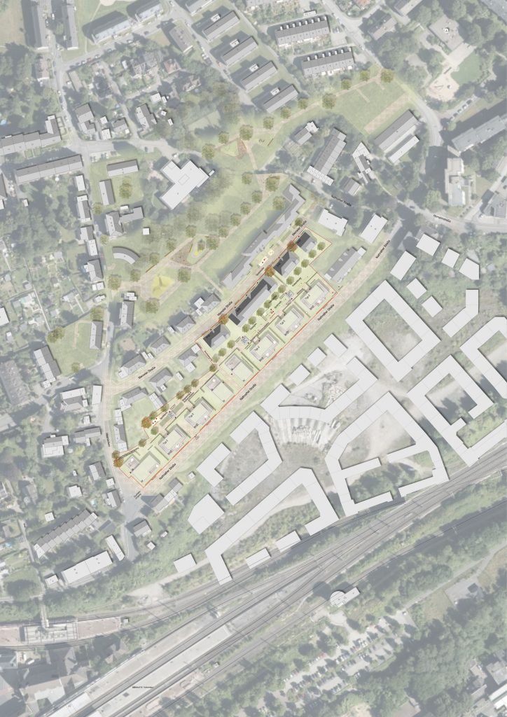 Unser Konzept führt die vor Ort vorherrschende, offene Bauweise fort. Durch eine Aufwertung und Ergänzung der vorhandenen Wegestrukturen soll die Vernetzung im Quartier verbessert werden: Die bereits vorhandene Fußwegeverbindung zwischen Nathrather und Memeler Straße wird baulich aufgegriffen und in Bedeutung und Funktion aufgewertet.